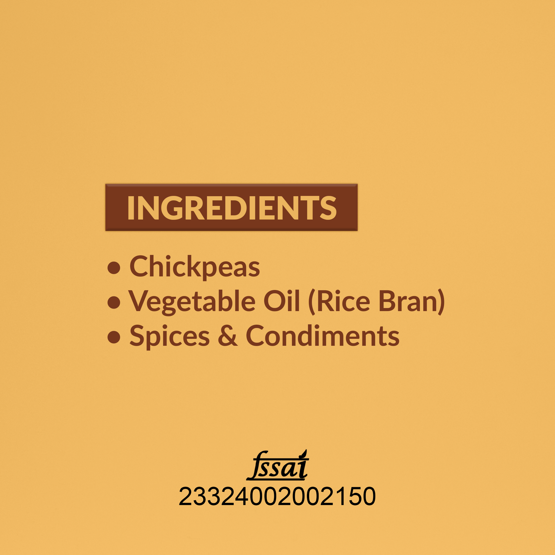 Chickpeas, Vegetable Oil, Spices & Condiments (Onion Powder, Red Chilli Powder, Amchur Powder, Coriander Seed Powder, Garlic Flakes & Powder, Ginger Powder, Black Pepper Powder, Turmeric Powder, Spice Extract, Fenugreek), Iodised Salt, Acidifying Agent(Citric Acid)