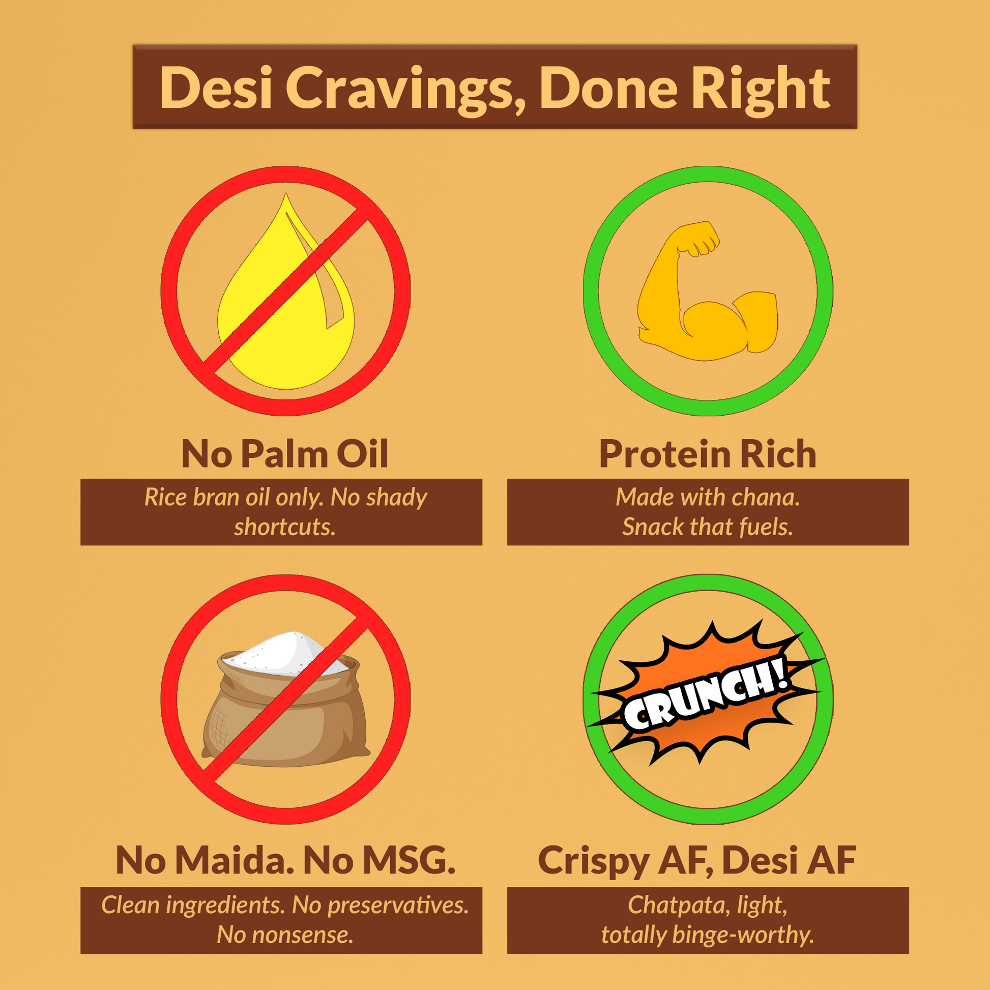 Crafted with our zero palm oil promise and cooked in rice bran oil, Chapta Chatpata is the desi namkeen you can munch on without guilt. High in plant protein, naturally gluten-free, and free from artificial colours or preservatives — it’s a snack that delivers both flavour and clean ingredients.