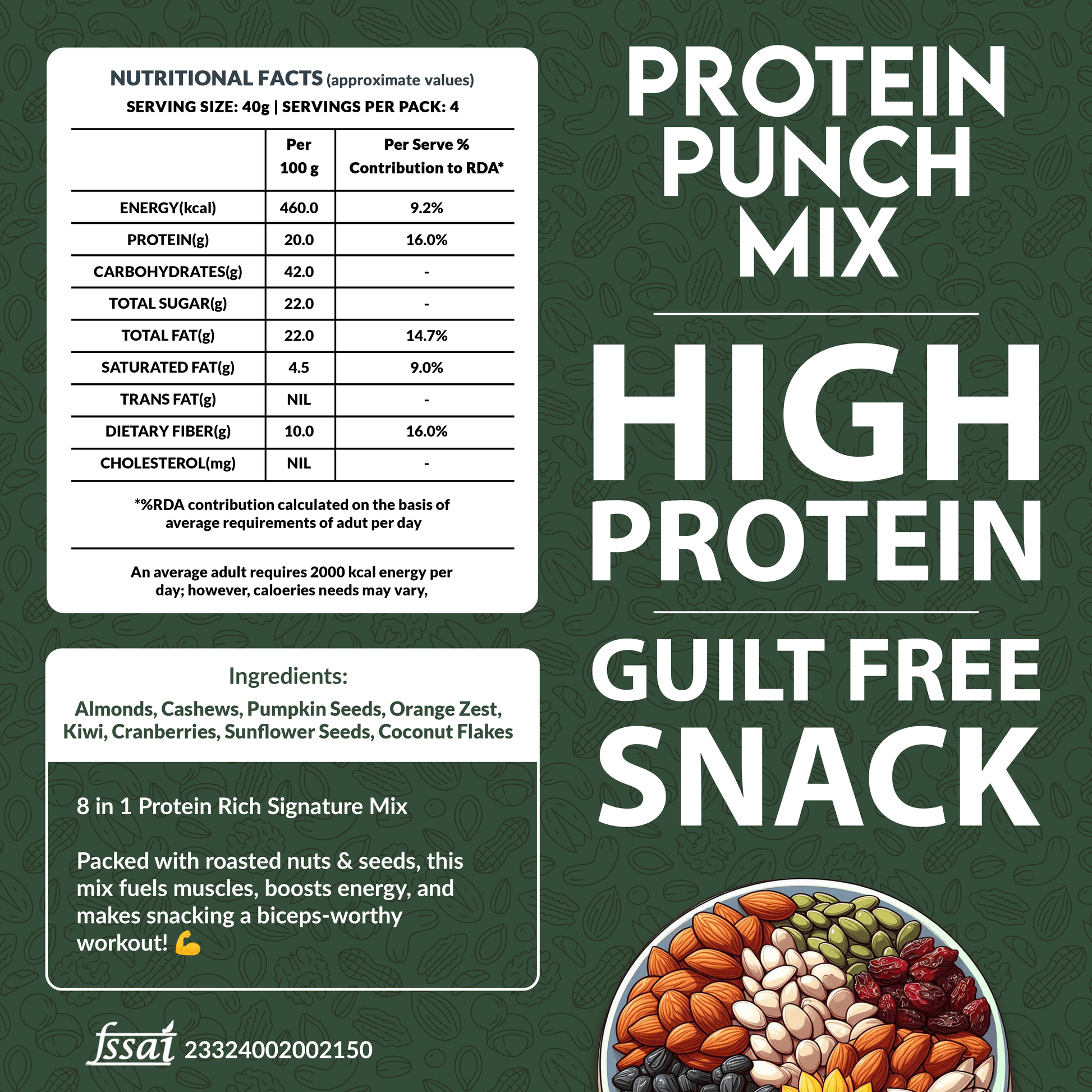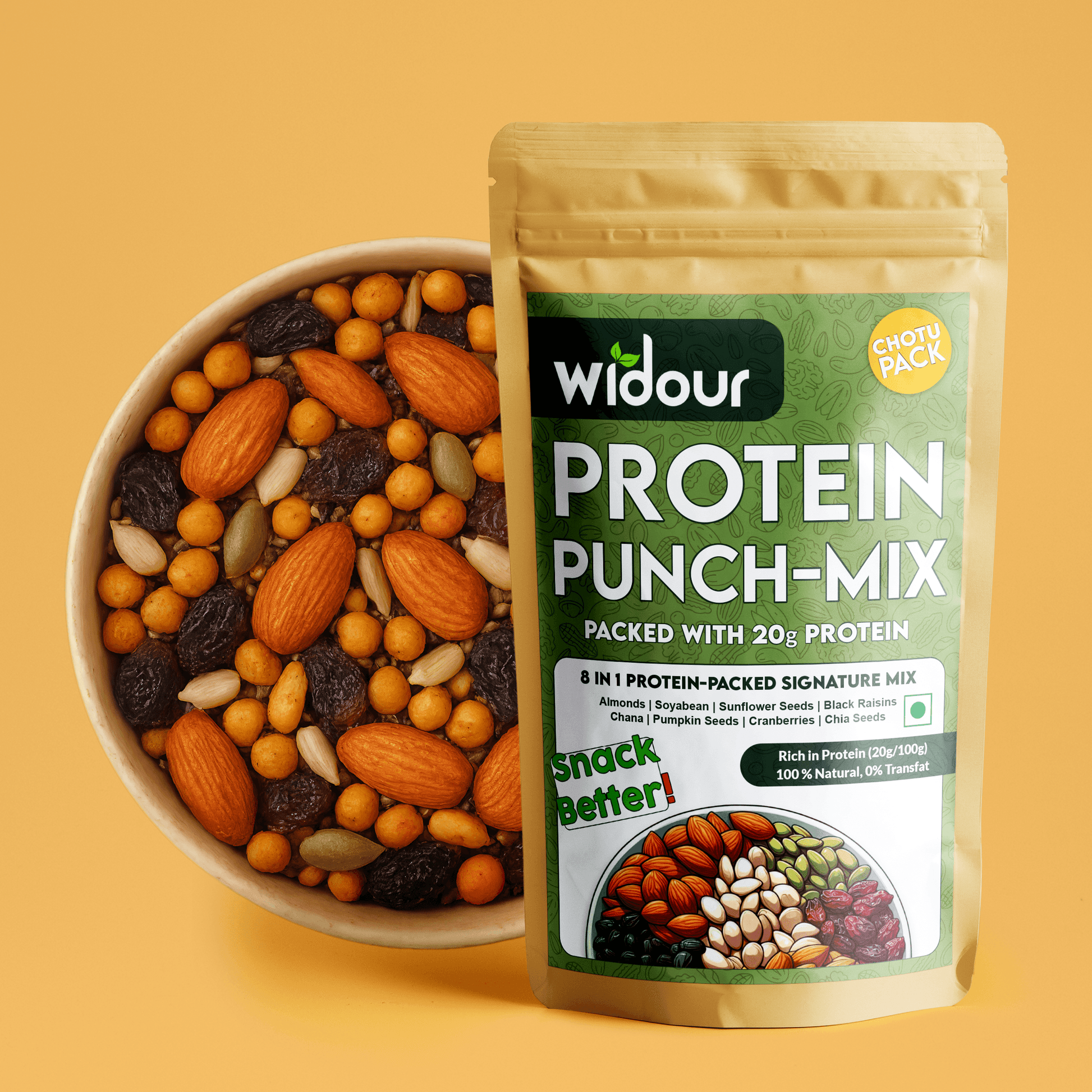 Boost your day with Widour Premium 8-in-1 Protein Punch Mix! Specifically designed for those who take snacking seriously, this blend contains Roasted Almonds, Roasted Soybean, Roasted Sunflower Seeds, Black Raisins, Roasted Chana, Roasted Pumpkin Seeds, Cranberries, and Chia Seeds, providing an impressive 32g of protein per pack. Expertly roasted for maximum flavor and crunch, this nutrient-packed mix is the perfect companion for workouts, busy days, or anytime cravings strike. Made with 100% natural ingredients and no trans fat, our Protein Punch Mix fuels your body without compromising on taste or quality. At Widour Foods, our motto is to Snack Better. So say goodbye to boring snacks and choose this high-protein powerhouse that keeps you energized, satisfied, and guilt-free. Why opt for Protein Punch Mix? It's loaded with protein to fuel your active lifestyle, packed with superfoods for all-day energy, and naturally.