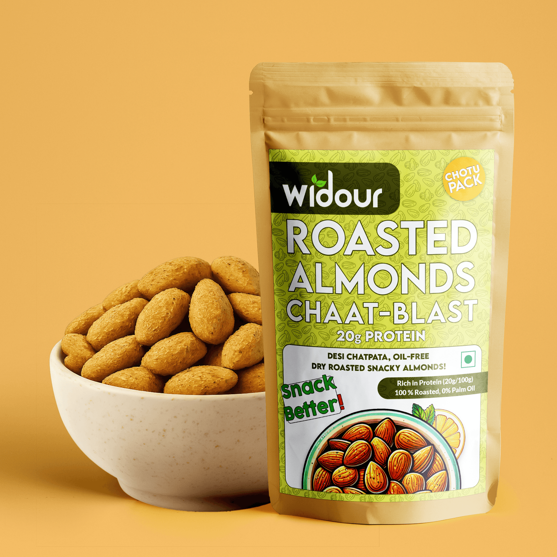 Experience a flavorful journey with Widour Signature Roasted Almonds - Chaat Blast. Lathered with our signature Chaat Blast seasoning mix, these roasted almonds offer an explosion of tangy, spicy, and savory flavors reminiscent of authentic Indian street food. With an impressive 32g of protein per pack, this snack is not just delicious - it also provides the necessary nutrition for a productive day. Made with 100% natural ingredients and no trans fat, Chaat Blast offers a guilt-free indulgence for all your cravings. At Widour Foods, we are committed to providing better snacking options. That's why we invite you to upgrade your snacking experience with the bold and irresistible flavors of Chaat Blast Roasted Almonds. What sets Chaat Blast Roasted Almonds apart? High protein content for sustained energy and satisfaction, a tantalizing chaat masala-inspired spice blend, and only clean and natural ingredients.Upgrade your snack time with Widour!