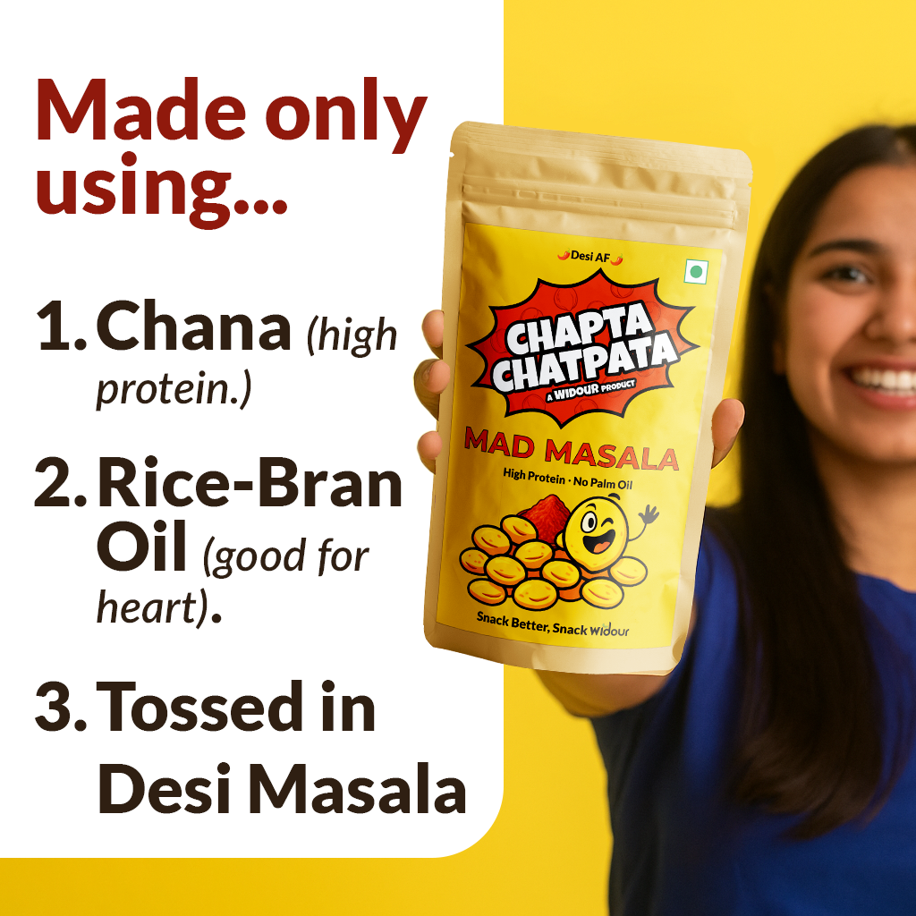 Chapta Chatpata is our take on a classic Indian-style fried snack — made cleaner. We start with crushed chickpeas, fry them in rice bran oil (good for the heart, zero palm oil), and season them with bold, honest flavours.