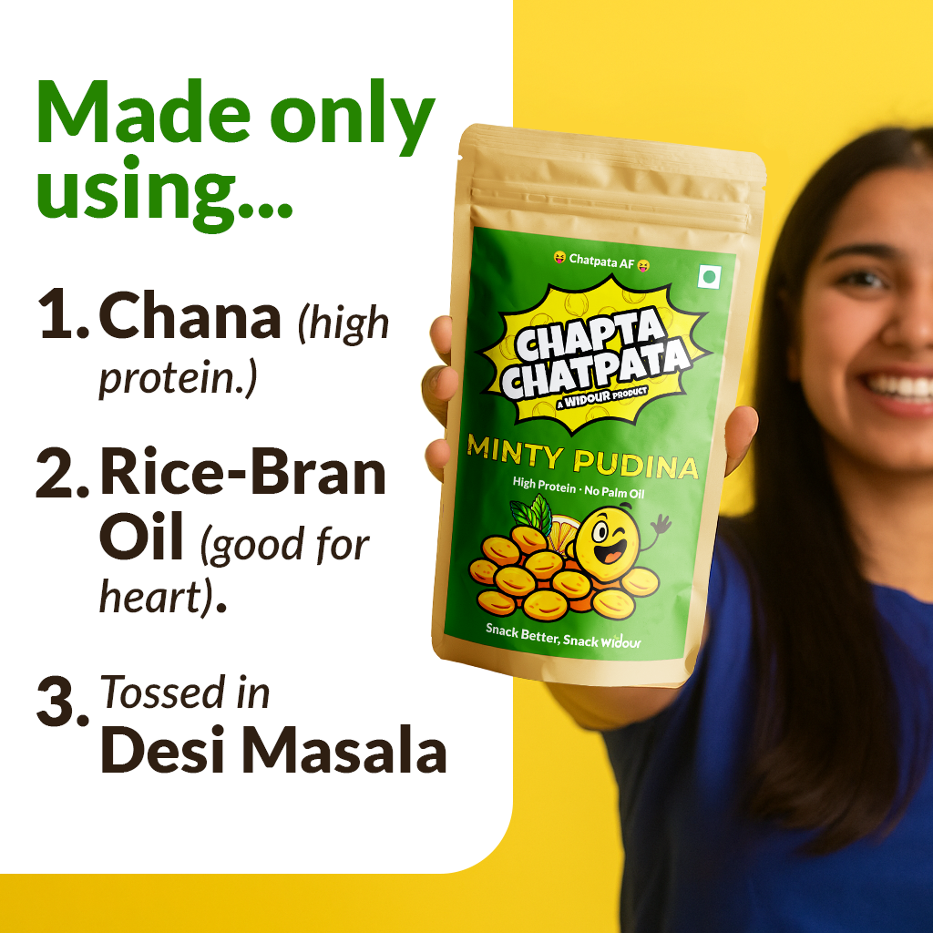 Chapta Chatpata is our take on a classic Indian-style fried snack — made cleaner. We start with crushed chickpeas, fry them in rice bran oil (good for the heart, zero palm oil), and season them with bold, honest flavours.